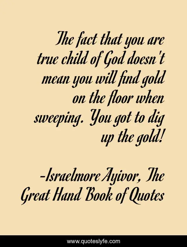 This page presents the quote "The fact that you are true child of God doesn't mean you will find gold on the floor when sweeping. You got to dig up the gold!". Author of this quote is Israelmore Ayivor, The Great Hand Book of Quotes. This quote is about hard-worker, food-for-thought, do-something, hard-work, gold, floor, god, dig, child,.