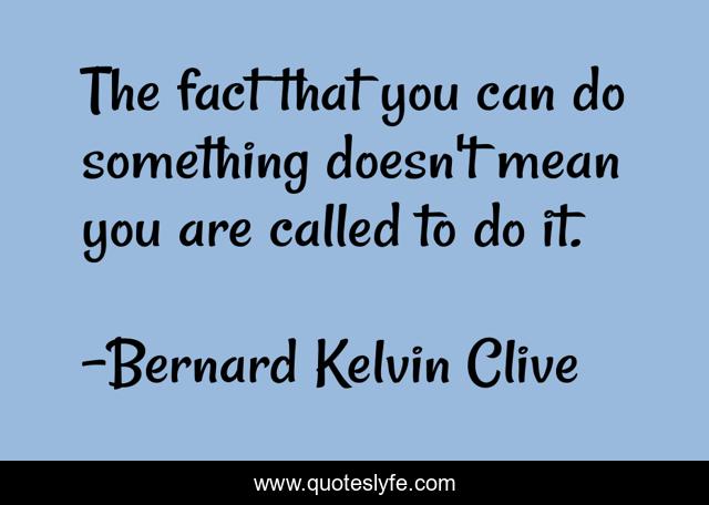 This page presents the quote "The fact that you can do something doesn't mean you are called to do it.". Author of this quote is Bernard Kelvin Clive. This quote is about passionate-living, dreams-inspirational, purpose-of-life, personal-brand, purpose-driven-life,.