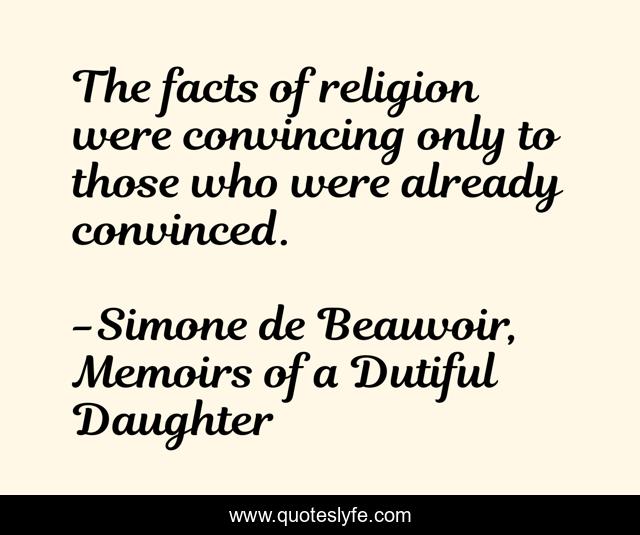 This page presents the quote "The facts of religion were convincing only to those who were already convinced.". Author of this quote is Simone de Beauvoir, Memoirs of a Dutiful Daughter. This quote is about paris, france, religion, women-writers, feminism, history,.
