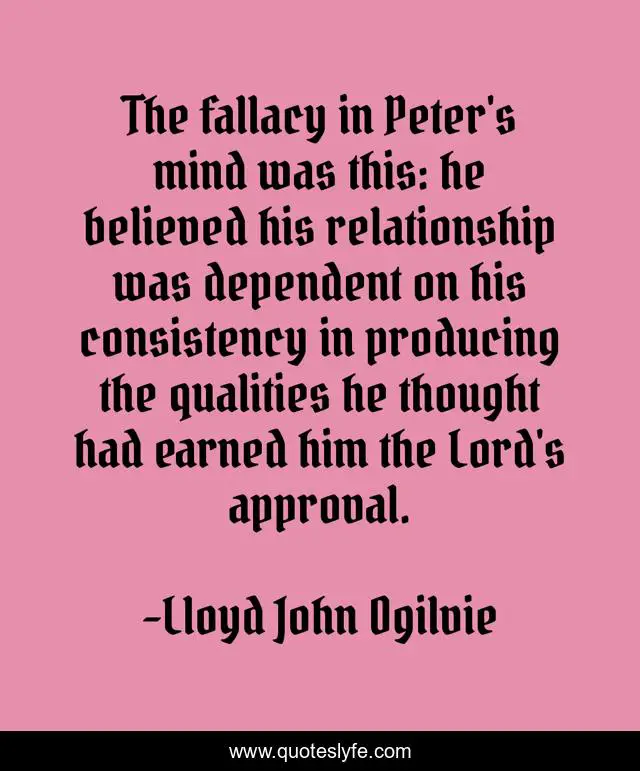 This page presents the quote "The fallacy in Peter's mind was this: he believed his relationship was dependent on his consistency in producing the qualities he thought had earned him the Lord's approval.". Author of this quote is Lloyd John Ogilvie. This quote is about earn, grace, fallacy,.