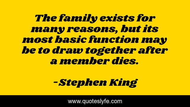 This page presents the quote "The family exists for many reasons, but its most basic function may be to draw together after a member dies.". Author of this quote is Stephen King. This quote is about death, family, mourning,.