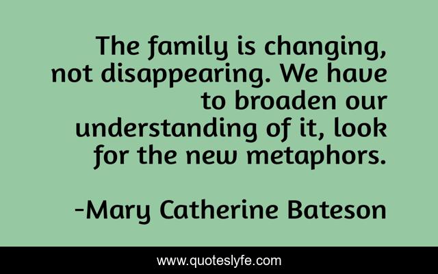 This page presents the quote "The family is changing, not disappearing. We have to broaden our understanding of it, look for the new metaphors.". Author of this quote is Mary Catherine Bateson. This quote is about new, look, understanding,.
