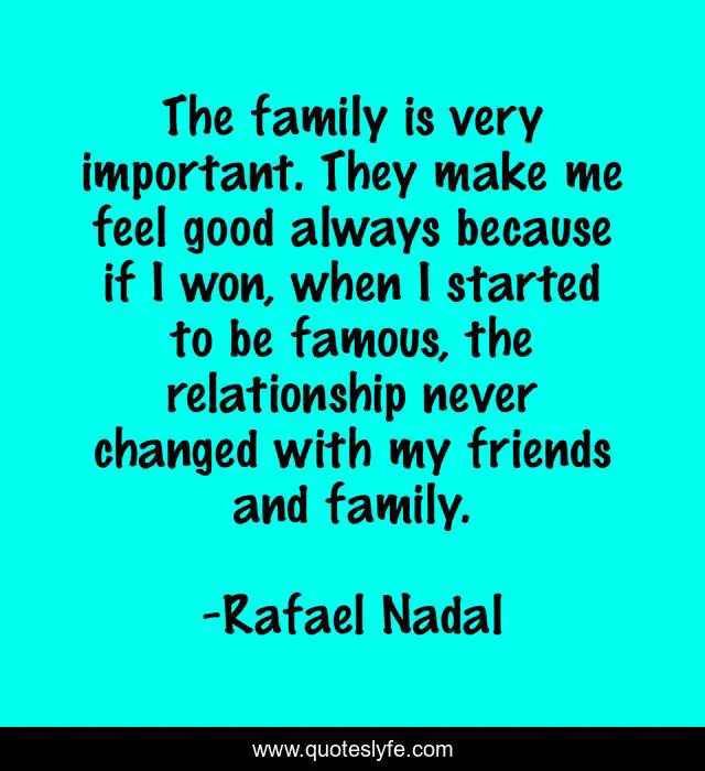 This page presents the quote "The family is very important. They make me feel good always because if I won, when I started to be famous, the relationship never changed with my friends and family.". Author of this quote is Rafael Nadal. This quote is about good, family, relationship,.
