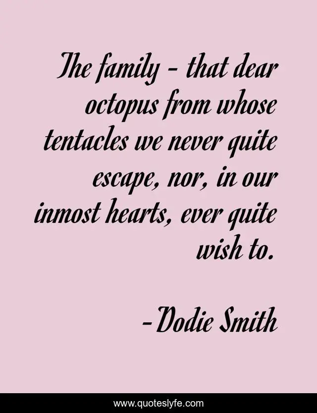 This page presents the quote "The family - that dear octopus from whose tentacles we never quite escape, nor, in our inmost hearts, ever quite wish to.". Author of this quote is Dodie Smith. This quote is about love, tentacles, family, affection, family-ties,.