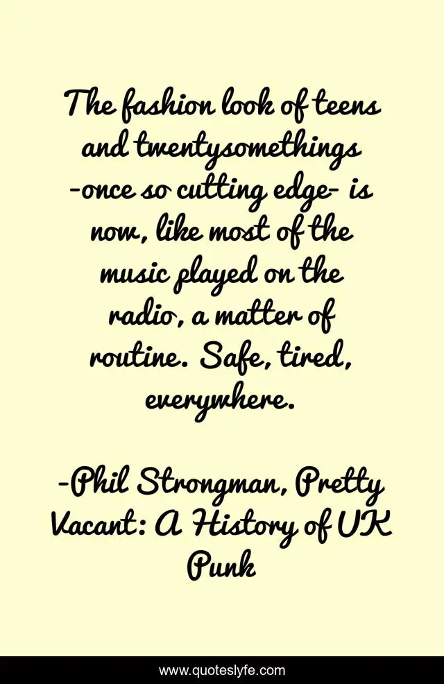 This page presents the quote "The fashion look of teens and twentysomethings -once so cutting edge- is now, like most of the music played on the radio, a matter of routine. Safe, tired, everywhere.". Author of this quote is Phil Strongman, Pretty Vacant: A History of UK Punk. This quote is about fashion-statement, fashion, music, punk, uk,.