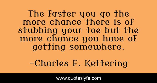 This page presents the quote "The faster you go the more chance there is of stubbing your toe but the more chance you have of getting somewhere.". Author of this quote is Charles F. Kettering. .