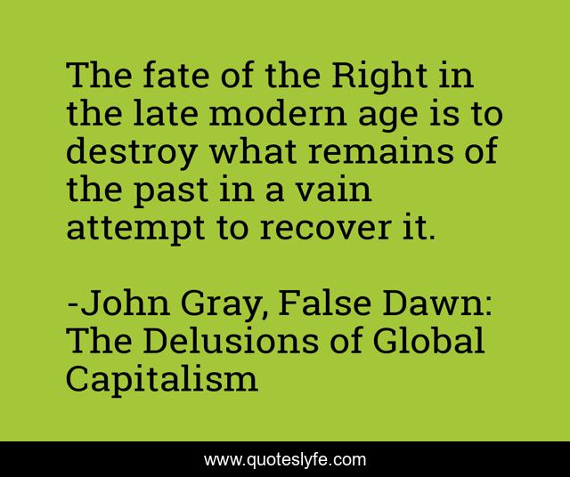 This page presents the quote "The fate of the Right in the late modern age is to destroy what remains of the past in a vain attempt to recover it.". Author of this quote is John Gray, False Dawn: The Delusions of Global Capitalism. This quote is about politics, antimodernism, right,.