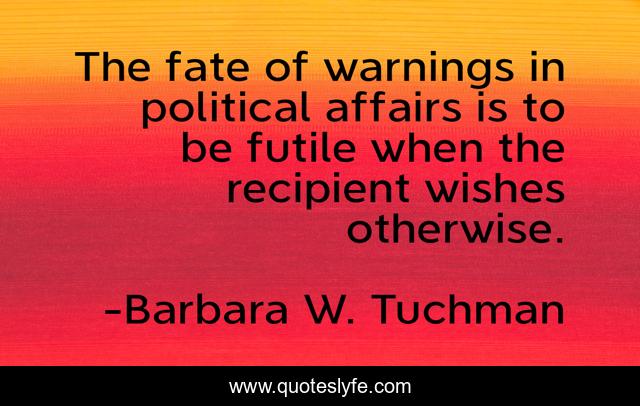 This page presents the quote "The fate of warnings in political affairs is to be futile when the recipient wishes otherwise.". Author of this quote is Barbara W. Tuchman. This quote is about foresight, prophecy, bias, humility, wisdom,.