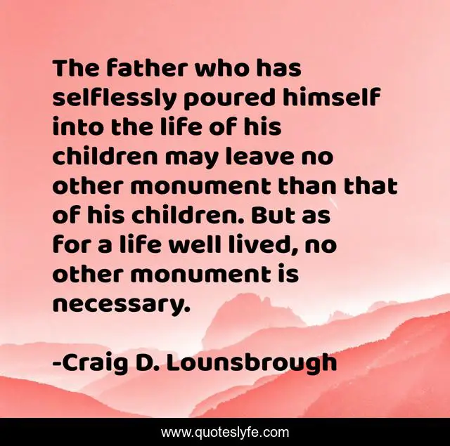 This page presents the quote "The father who has selflessly poured himself into the life of his children may leave no other monument than that of his children. But as for a life well lived, no other monument is necessary.". Author of this quote is Craig D. Lounsbrough. This quote is about selflessness, legacy, fatherhood, children, father, achieve, dad, life, parent,.