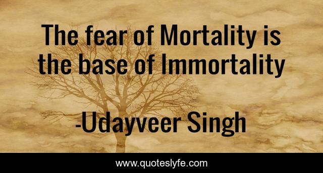 This page presents the quote "The fear of Mortality is the base of Immortality". Author of this quote is Udayveer Singh. This quote is about life, death, art, i-am-immortal, immortal, immortality, base, mortality, mortal,.