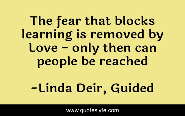 This page presents the quote "The fear that blocks learning is removed by Love - only then can people be reached". Author of this quote is Linda Deir, Guided. This quote is about spirit-guides, angels, true-story,.