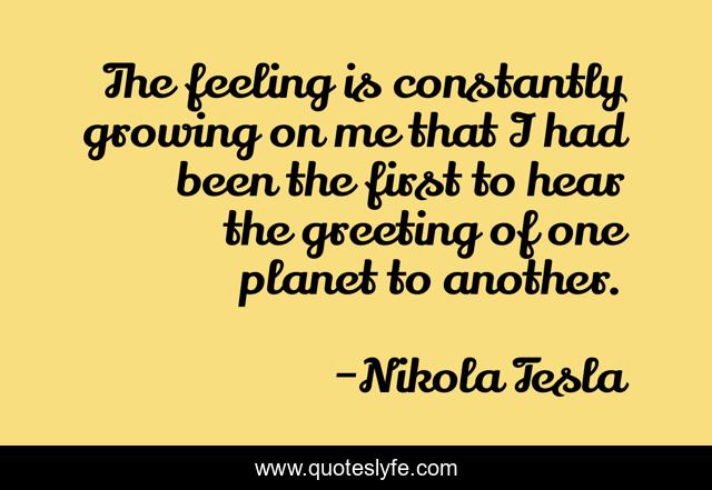 This page presents the quote "The feeling is constantly growing on me that I had been the first to hear the greeting of one planet to another.". Author of this quote is Nikola Tesla. This quote is about me, growing, feeling,.