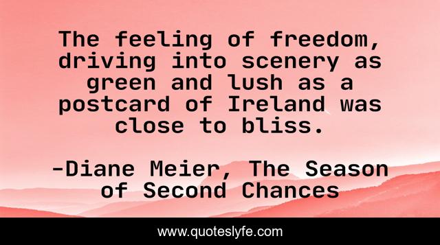 This page presents the quote "The feeling of freedom, driving into scenery as green and lush as a postcard of Ireland was close to bliss.". Author of this quote is Diane Meier, The Season of Second Chances. This quote is about driving, picturesque, freedom, content, bliss, happiness,.
