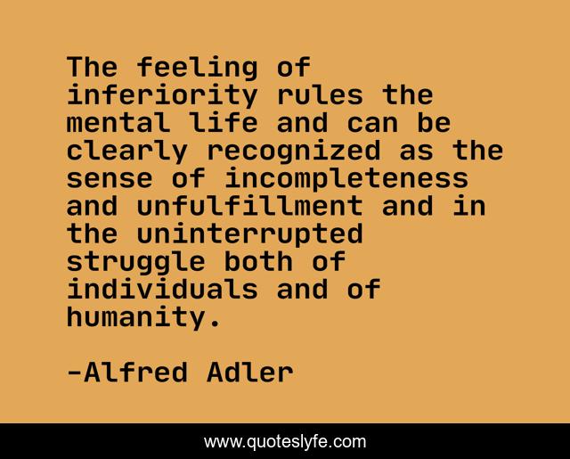 This page presents the quote "The feeling of inferiority rules the mental life and can be clearly recognized as the sense of incompleteness and unfulfillment and in the uninterrupted struggle both of individuals and of humanity.". Author of this quote is Alfred Adler. .