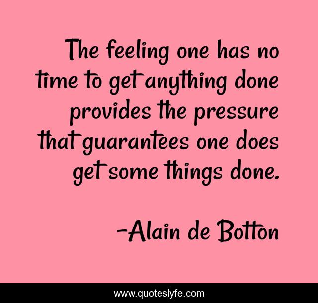 This page presents the quote "The feeling one has no time to get anything done provides the pressure that guarantees one does get some things done.". Author of this quote is Alain de Botton. This quote is about pressure, accomplishments, time,.