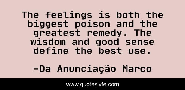 This page presents the quote "The feelings is both the biggest poison and the greatest remedy. The wisdom and good sense define the best use.". Author of this quote is Da Anunciação Marco. This quote is about confidence, positive, motivational, behaviour, attitude, optimistic, inspirational, enthusiasm, self-esteem,.