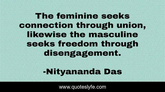 This page presents the quote "The feminine seeks connection through union, likewise the masculine seeks freedom through disengagement.". Author of this quote is Nityananda Das. This quote is about union, freedom, feminine, connection, masculine, disengagement,.
