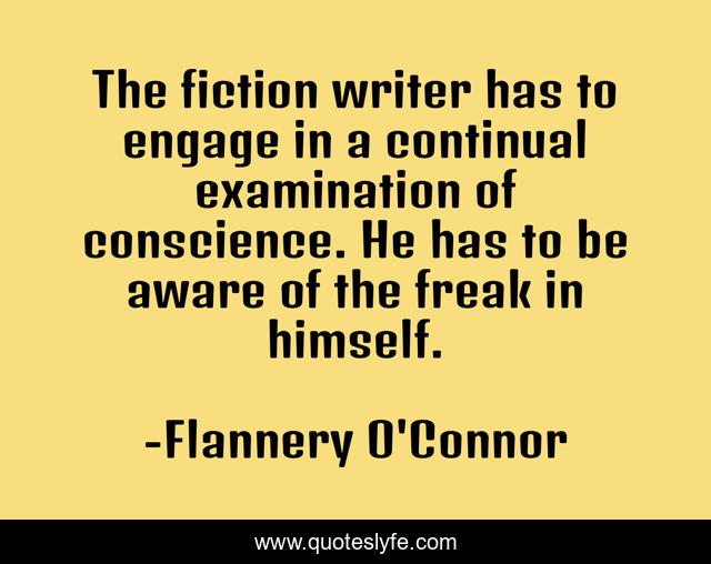 This page presents the quote "The fiction writer has to engage in a continual examination of conscience. He has to be aware of the freak in himself.". Author of this quote is Flannery O'Connor. This quote is about writing, writing-process, writing-advice,.