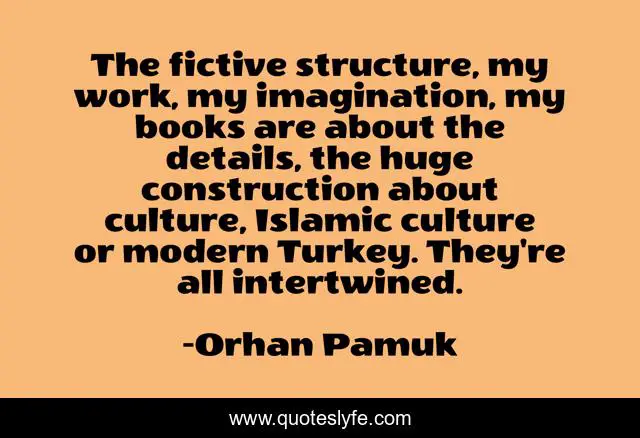 This page presents the quote "The fictive structure, my work, my imagination, my books are about the details, the huge construction about culture, Islamic culture or modern Turkey. They're all intertwined.". Author of this quote is Orhan Pamuk. This quote is about work, culture, construction,.