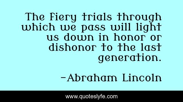 This page presents the quote "The fiery trials through which we pass will light us down in honor or dishonor to the last generation.". Author of this quote is Abraham Lincoln. .