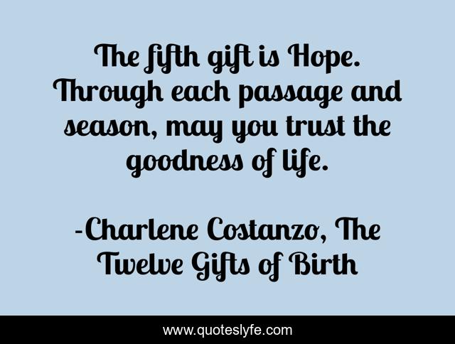 This page presents the quote "The fifth gift is Hope. Through each passage and season, may you trust the goodness of life.". Author of this quote is Charlene Costanzo, The Twelve Gifts of Birth. This quote is about blessing, character-building, goodness, hope, inspiration,.