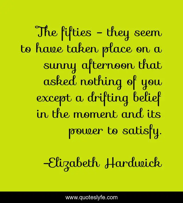 This page presents the quote "The fifties - they seem to have taken place on a sunny afternoon that asked nothing of you except a drifting belief in the moment and its power to satisfy.". Author of this quote is Elizabeth Hardwick. This quote is about moment, belief,.
