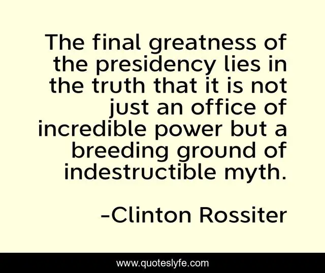 This page presents the quote "The final greatness of the presidency lies in the truth that it is not just an office of incredible power but a breeding ground of indestructible myth.". Author of this quote is Clinton Rossiter. .