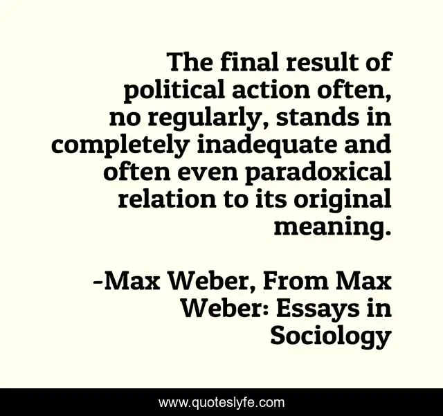 This page presents the quote "The final result of political action often, no regularly, stands in completely inadequate and often even paradoxical relation to its original meaning.". Author of this quote is Max Weber, From Max Weber: Essays in Sociology. This quote is about politics, policies, laws,.