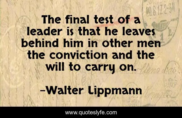This page presents the quote "The final test of a leader is that he leaves behind him in other men the conviction and the will to carry on.". Author of this quote is Walter Lippmann. This quote is about test, men, leader,.