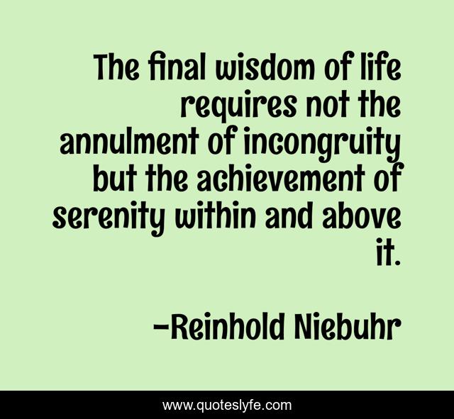 This page presents the quote "The final wisdom of life requires not the annulment of incongruity but the achievement of serenity within and above it.". Author of this quote is Reinhold Niebuhr. This quote is about life, serenity, achievement,.