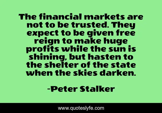 This page presents the quote "The financial markets are not to be trusted. They expect to be given free reign to make huge profits while the sun is shining, but hasten to the shelter of the state when the skies darken.". Author of this quote is Peter Stalker. This quote is about money, economics,.