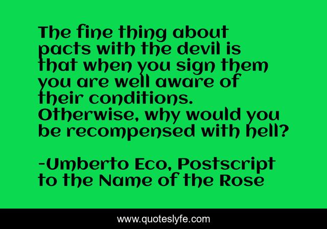 This page presents the quote "The fine thing about pacts with the devil is that when you sign them you are well aware of their conditions. Otherwise, why would you be recompensed with hell?". Author of this quote is Umberto Eco, Postscript to the Name of the Rose. This quote is about devil, destiny, fate, choices, responsibility, self-deception,.