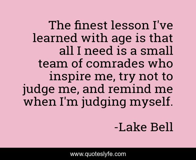 This page presents the quote "The finest lesson I've learned with age is that all I need is a small team of comrades who inspire me, try not to judge me, and remind me when I'm judging myself.". Author of this quote is Lake Bell. This quote is about myself, inspire, team,.