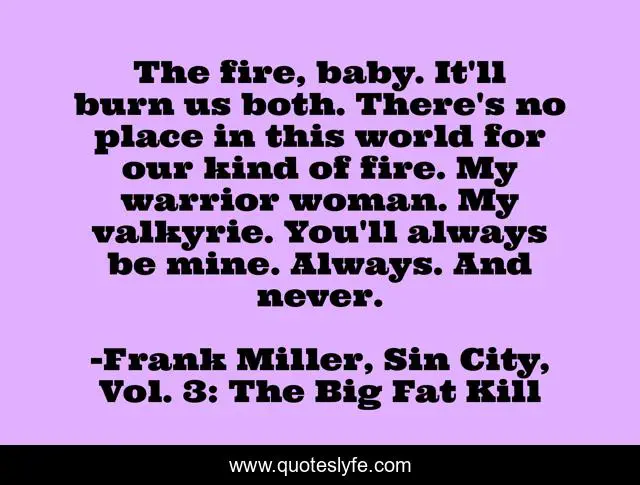 This page presents the quote "The fire, baby. It'll burn us both. There's no place in this world for our kind of fire. My warrior woman. My valkyrie. You'll always be mine. Always. And never.". Author of this quote is Frank Miller, Sin City, Vol. 3: The Big Fat Kill. This quote is about passion, lost-love, sin-city,.