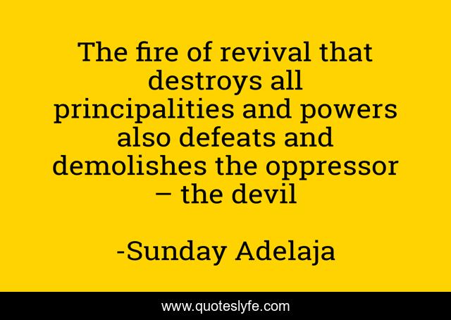 This page presents the quote "The fire of revival that destroys all principalities and powers also defeats and demolishes the oppressor – the devil". Author of this quote is Sunday Adelaja. This quote is about fire, principalities, powers-oppressor, revival,.