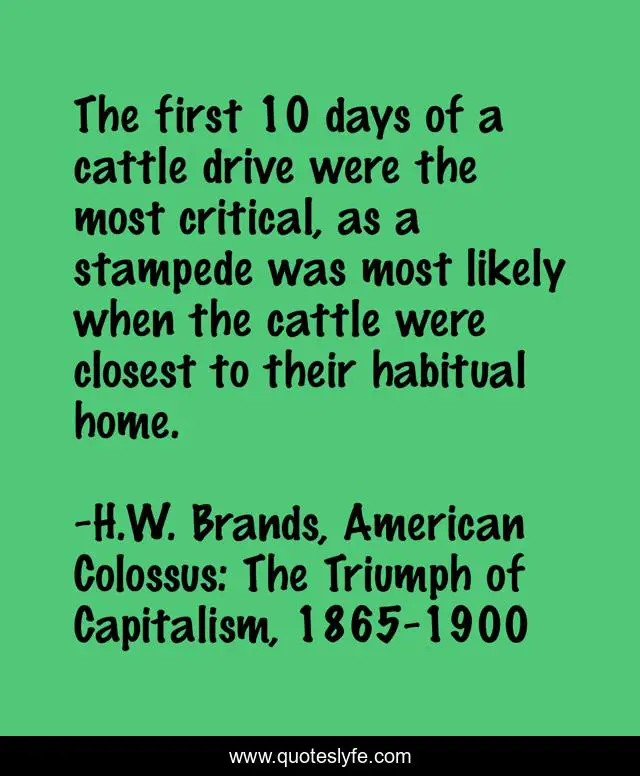 This page presents the quote "The first 10 days of a cattle drive were the most critical, as a stampede was most likely when the cattle were closest to their habitual home.". Author of this quote is H.W. Brands, American Colossus: The Triumph of Capitalism, 1865-1900. This quote is about culture, addiction, discipleship, lifestyle, idolatry,.