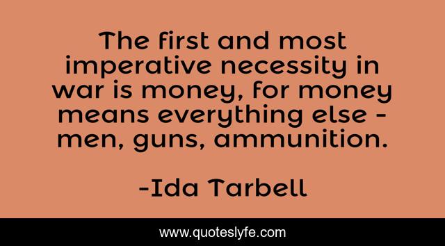 This page presents the quote "The first and most imperative necessity in war is money, for money means everything else - men, guns, ammunition.". Author of this quote is Ida Tarbell. This quote is about money, men, guns,.