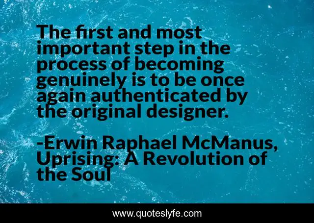 This page presents the quote "The first and most important step in the process of becoming genuinely is to be once again authenticated by the original designer.". Author of this quote is Erwin Raphael McManus, Uprising: A Revolution of the Soul. .