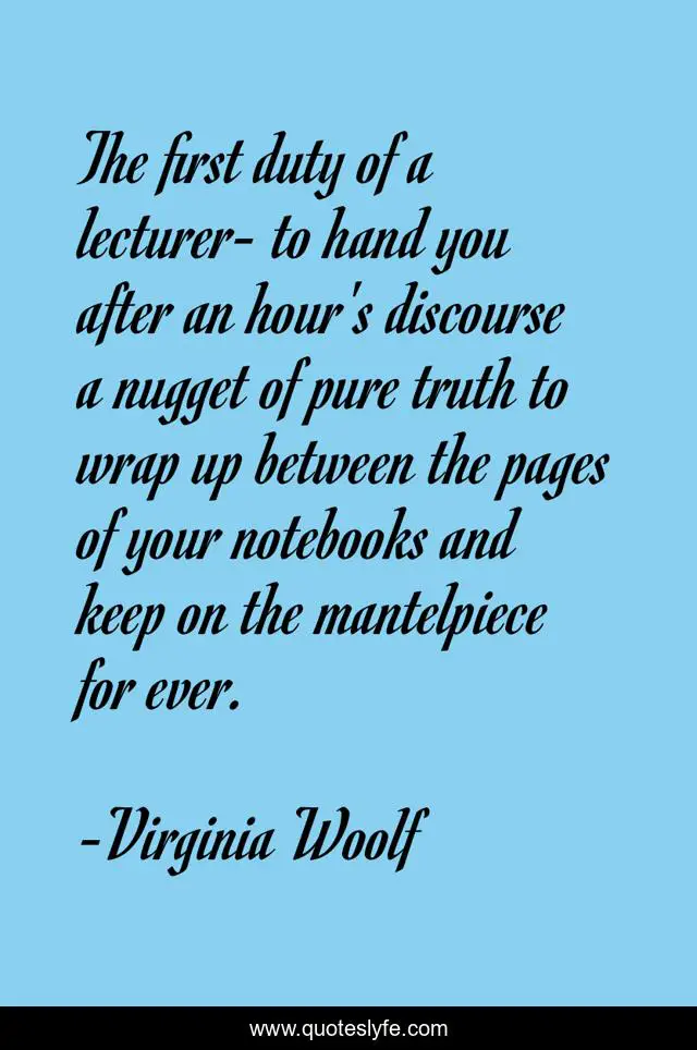 This page presents the quote "The first duty of a lecturer- to hand you after an hour's discourse a nugget of pure truth to wrap up between the pages of your notebooks and keep on the mantelpiece for ever.". Author of this quote is Virginia Woolf. This quote is about teaching, teachers,.