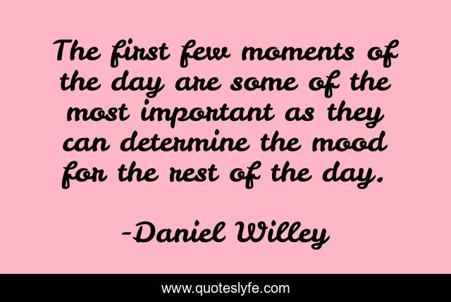 This page presents the quote "The first few moments of the day are some of the most important as they can determine the mood for the rest of the day.". Author of this quote is Daniel Willey. This quote is about motivation, mood, morning, early, day, first,.