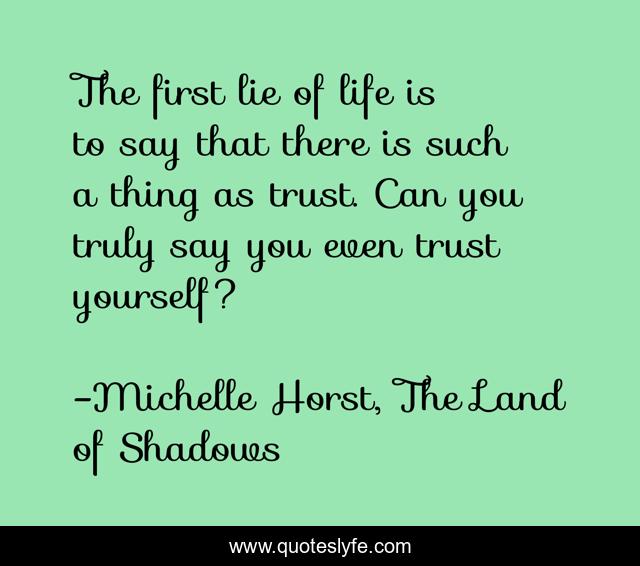 This page presents the quote "The first lie of life is to say that there is such a thing as trust. Can you truly say you even trust yourself?". Author of this quote is Michelle Horst, The Land of Shadows. .