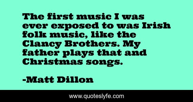This page presents the quote "The first music I was ever exposed to was Irish folk music, like the Clancy Brothers. My father plays that and Christmas songs.". Author of this quote is Matt Dillon. This quote is about music, father, first,.