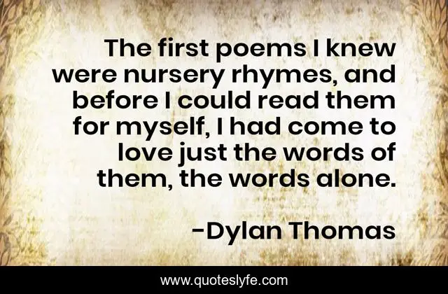 This page presents the quote "The first poems I knew were nursery rhymes, and before I could read them for myself, I had come to love just the words of them, the words alone.". Author of this quote is Dylan Thomas. This quote is about myself, love, words, affection,.