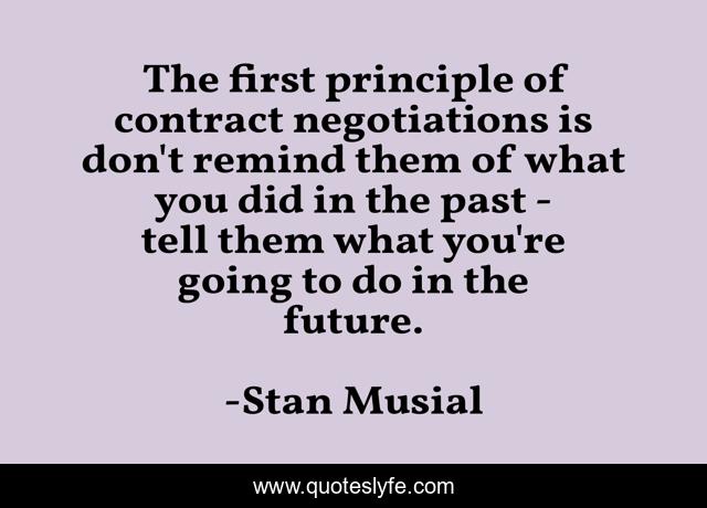 This page presents the quote "The first principle of contract negotiations is don't remind them of what you did in the past - tell them what you're going to do in the future.". Author of this quote is Stan Musial. This quote is about past, first,.