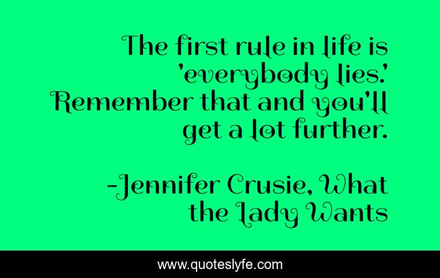 This page presents the quote "The first rule in life is 'everybody lies.' Remember that and you'll get a lot further.". Author of this quote is Jennifer Crusie, What the Lady Wants. This quote is about life, cynical, rules, rule, lies, lying, cynic,.