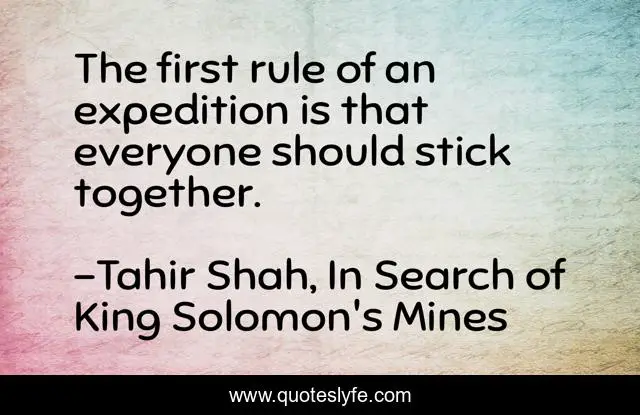 This page presents the quote "The first rule of an expedition is that everyone should stick together.". Author of this quote is Tahir Shah, In Search of King Solomon's Mines. This quote is about quest, rule, journey, expedition,.