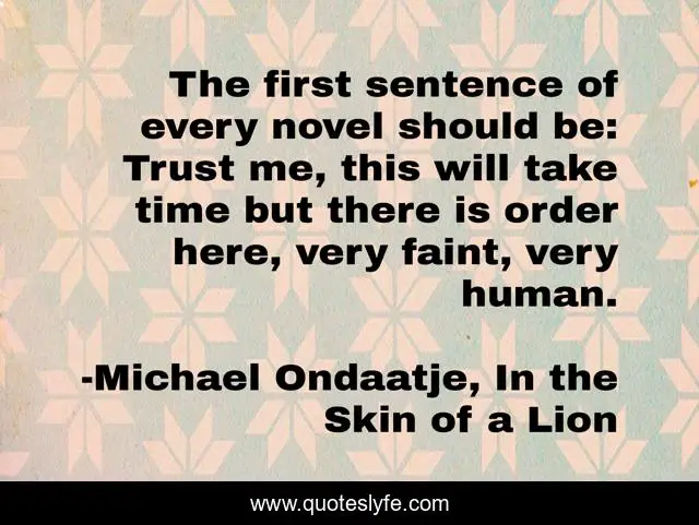 This page presents the quote "The first sentence of every novel should be: Trust me, this will take time but there is order here, very faint, very human.". Author of this quote is Michael Ondaatje, In the Skin of a Lion. This quote is about books, humanity, literature, novels,.