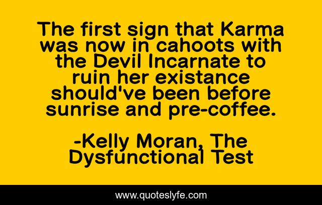 This page presents the quote "The first sign that Karma was now in cahoots with the Devil Incarnate to ruin her existance should've been before sunrise and pre-coffee.". Author of this quote is Kelly Moran, The Dysfunctional Test. This quote is about funny, devil, contemporary-romance, humorous, bad-day, books, karma, comedy,.