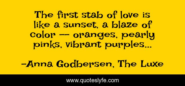This page presents the quote "The first stab of love is like a sunset, a blaze of color -- oranges, pearly pinks, vibrant purples...". Author of this quote is Anna Godbersen, The Luxe. This quote is about love, beauty, first-love, colors, sunset, affection,.