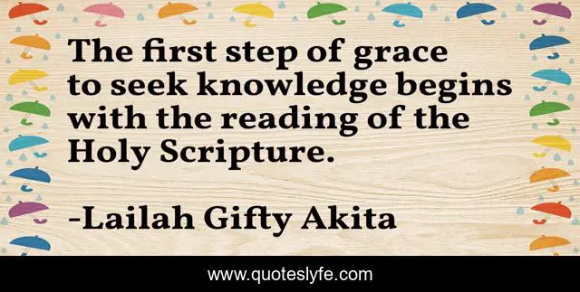 This page presents the quote "The first step of grace to seek knowledge begins with the reading of the Holy Scripture.". Author of this quote is Lailah Gifty Akita. This quote is about confidence, christian, knowledge, read, bible-study, motivational, theology, optimistic, positive,.